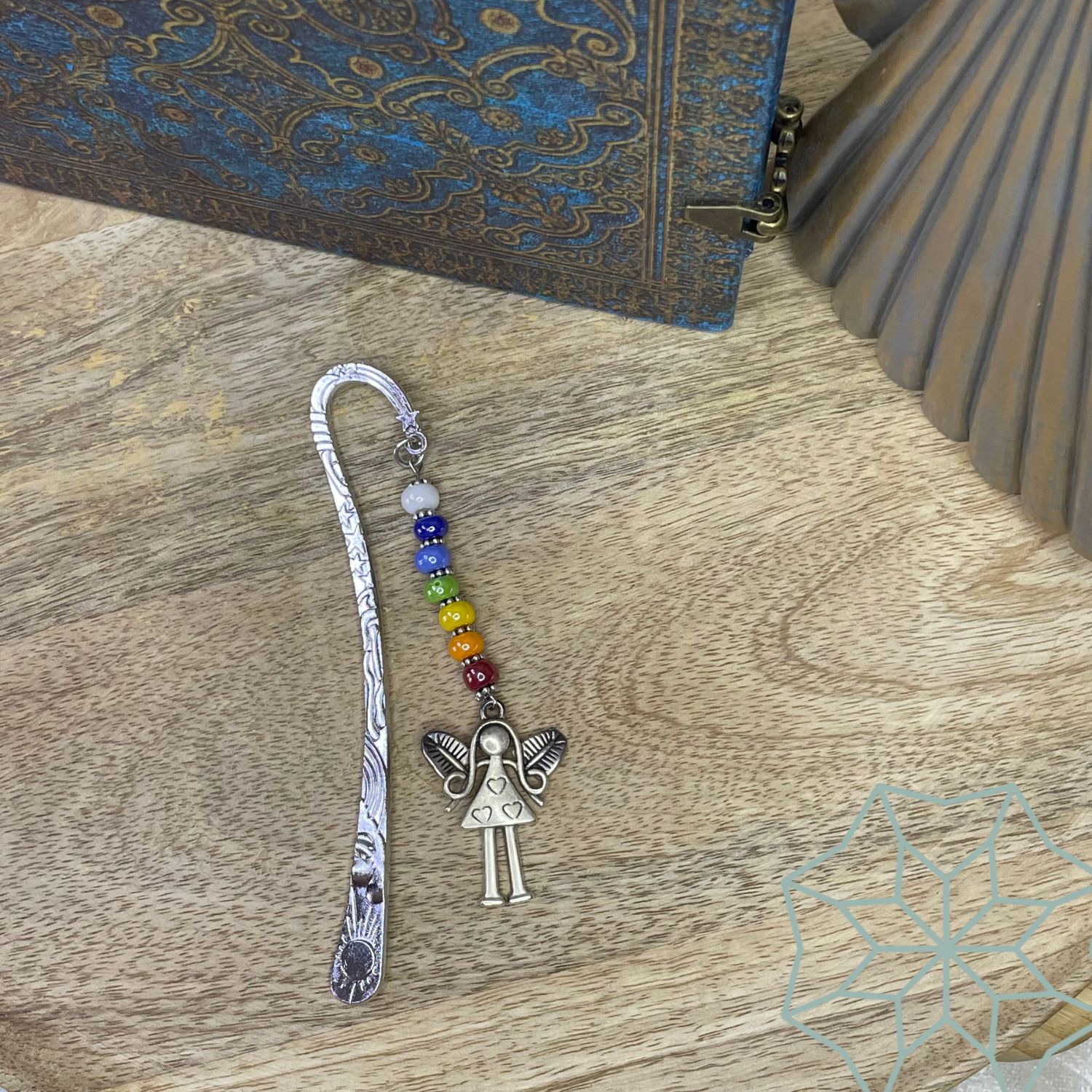 Marque-page en métal argenté, perle en verre, argentées et pampille.