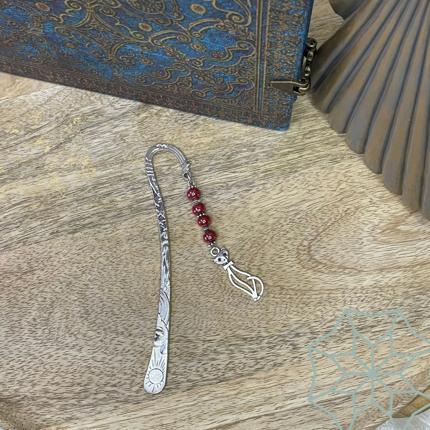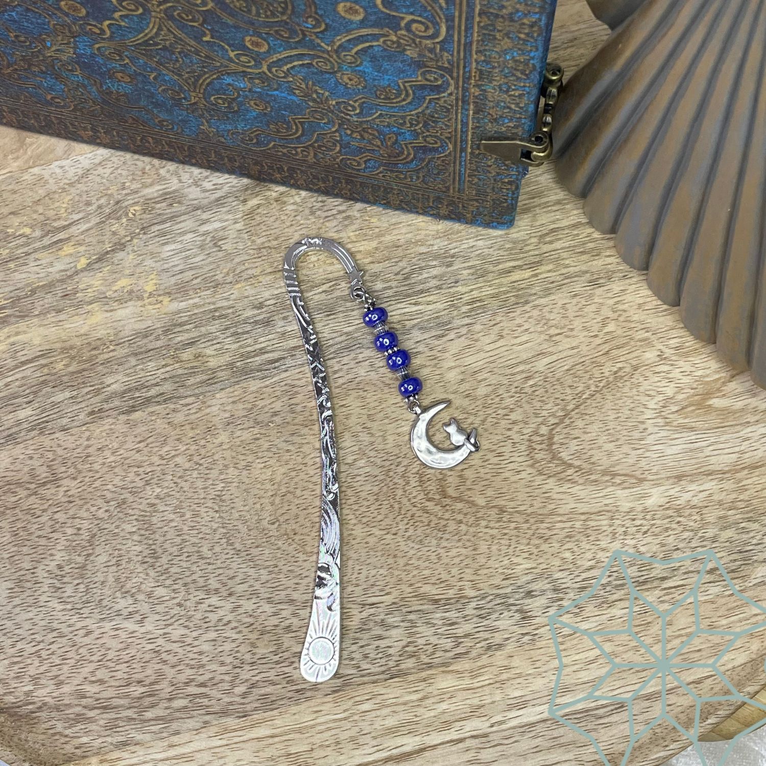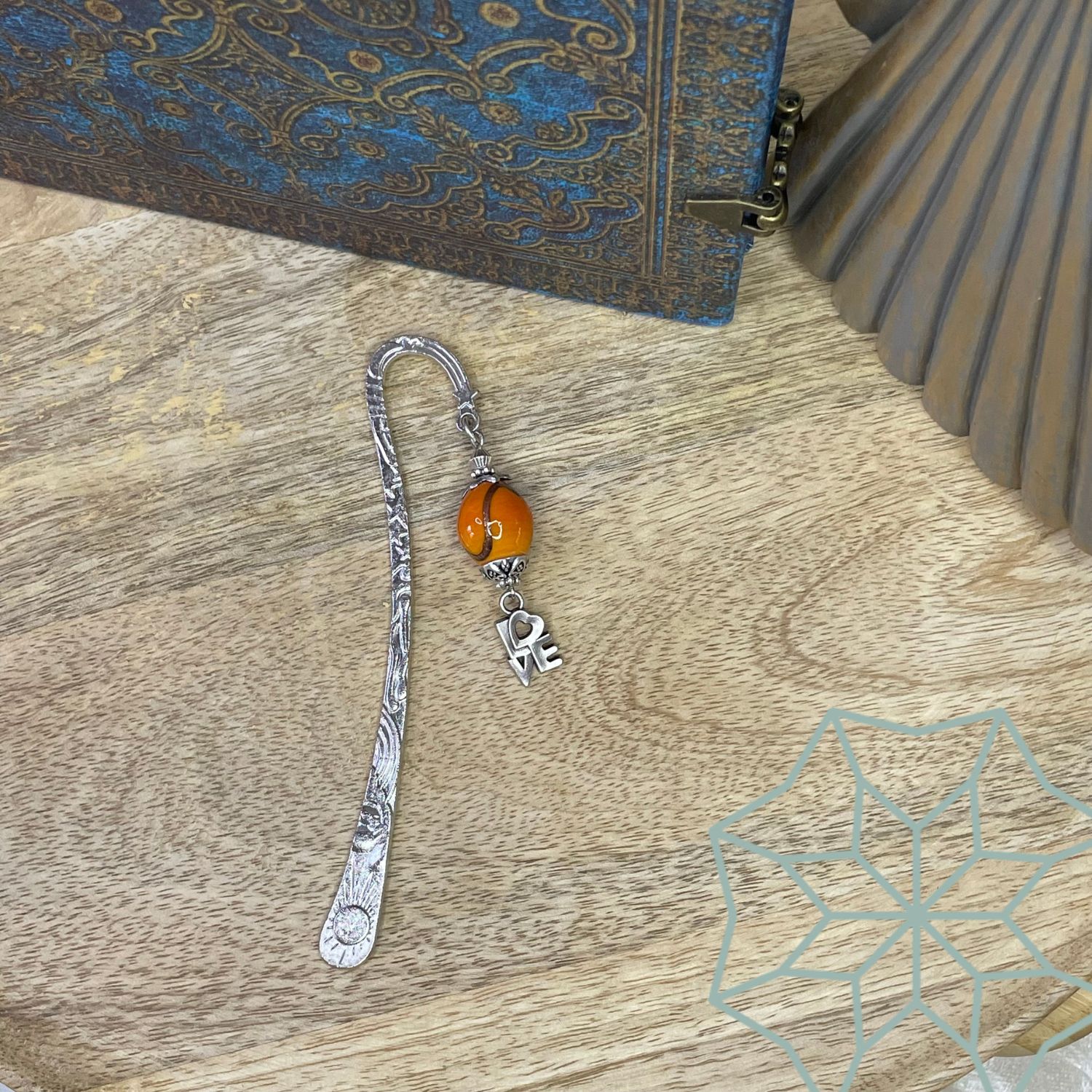 Marque-page en métal argenté, perles en verre, argentées et pampille.